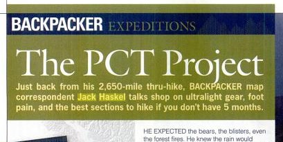 April 8, 2011 Backpacker PCT Project Read my BACKPACKER profile from my Pacific Crest Trail Project. Share Jack's stuff: Click to share on Reddit (Opens in new window) Reddit Click to share on Facebook (Opens in new window) Facebook Click to share on X (Opens in new window) X More Click to share on Pinterest (Opens in new window) Pinterest Click to email a link to a friend (Opens in new window) Email Like Loading... Related